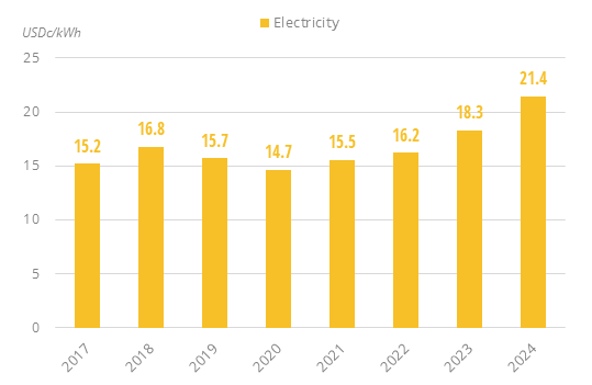 The price of electricity in industry has increased rapidly since 2020 (10%/year on average), reaching US$21.4c/kWh in 2024.