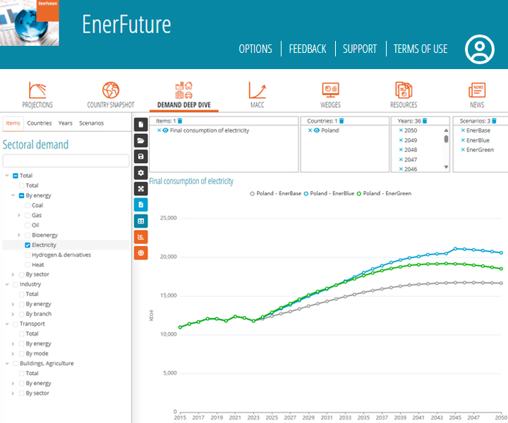 It allows users to track underlying factors throughout the industry, transport, residential and services sectors, as well as the dynamics of future energy demand thanks to a built-in sensitivity analysis to assess the impact of key drivers on energy use.