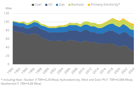 Total primary consumption has decreased by 4%/year since 2021 reaching 95.5 Mtoe in 2024. It increased before by 2%/year on average between 2015 and 2019 after a downward trend of -1.5%/year between 2011 and 2015.