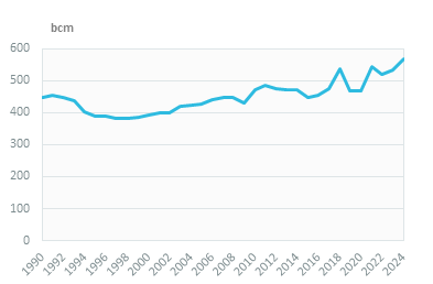 Gas consumption increased by 6% in 2024, reaching 566 bcm, after experiencing a 3% increase in 2023 and a 5% decrease in 2022. In 2021, it rebounded by 12% after dropping by 2% in 2020. It grew by around 5%/year between 2016 and 2019.