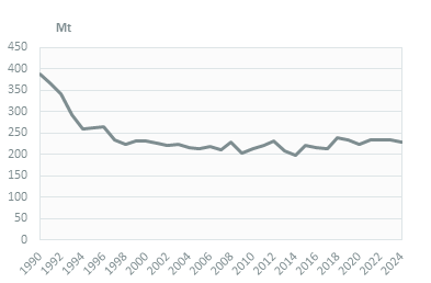 Coal and lignite consumption increased by 1.2%/year between 2020 and 2023, before decreasing by 2% in 2024 to 229 Mt. It increased by 3.4%/year between 2014 and 2019 and dropped by almost 11% in 2020.