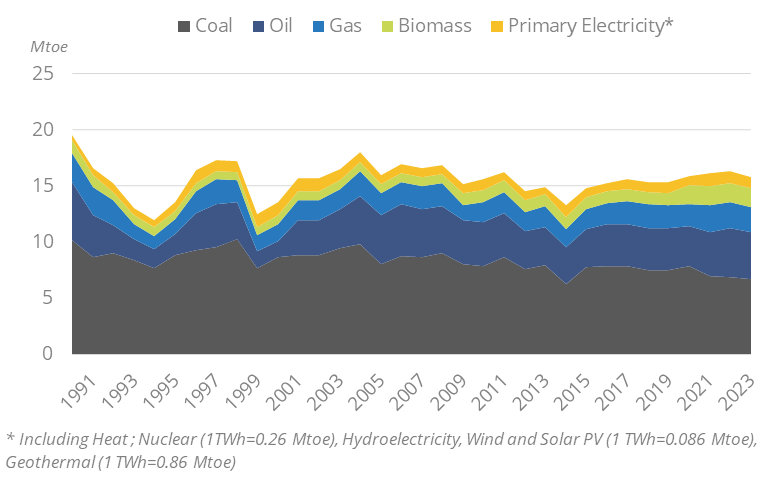 Total energy consumption has hovered around 16 Mtoe since 2005, with a 2.6%/year increase between 2014 (energy supply problems due to massive floods) and 2022 and a 3.3% drop in 2023 to 15.8 Mtoe.