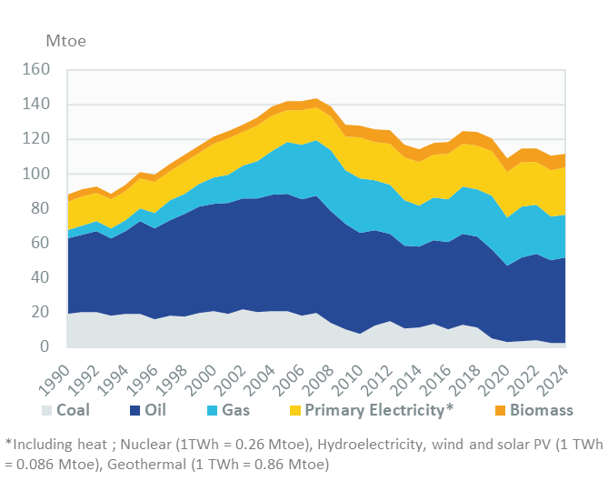 Total energy consumption increased by 1% in 2024 (112 Mtoe), after having remained around the average growth since 2021 (0.8%/year). Previously, it had declined by 1.6%/year between 2017 and 2019. The 2008 crisis slashed energy consumption (-3.3%/year until 2014), which recovered rapidly between 2014 and 2017 (+3%/year).