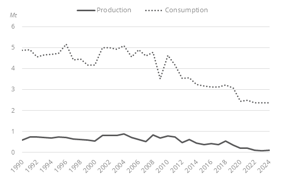 Coal consumption has been relatively stable since 2020, at around 2.4 Mt. It decreased by 4.4%/year between 2010 and 2019 and dropped by 21% in 2020. Coal production is very low and has decreased by almost 90% since 2010, reaching 0.1 Mt in 2024.