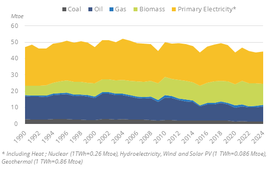 Total energy consumption increased by 1.3% in 2024, reaching 45 Mtoe, after decreasing between 2021 and 2023 (-1.4%/year). Between 2000 and 2020, it oscillated between 44 Mtoe and 52 Mtoe, following economic fluctuations.