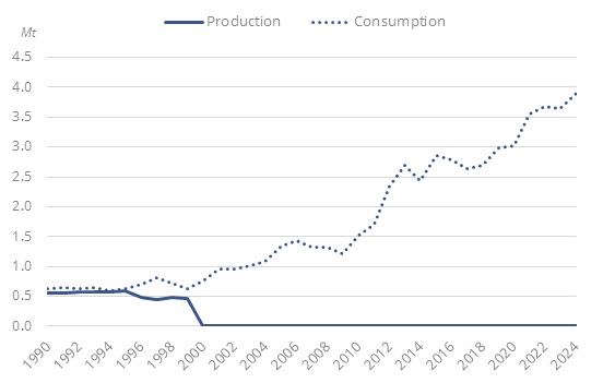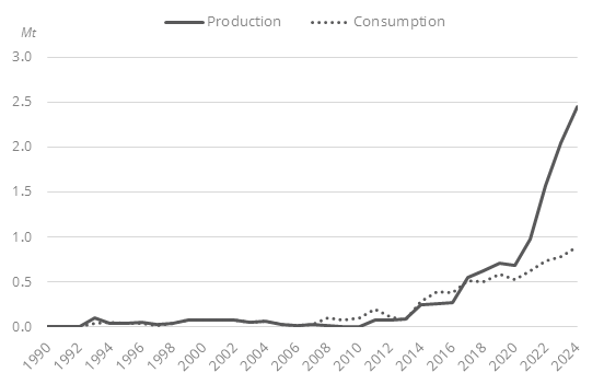 Coal production has more than tripled since 2020, reaching 2.5 Mt in 2024.