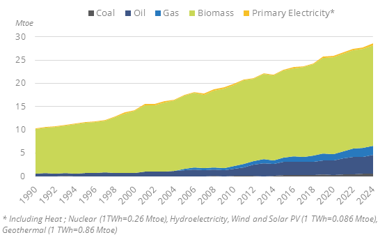 The primary energy consumption has been rising by 2.5%/year since 2010 to 28.6 Mtoe in 2024.