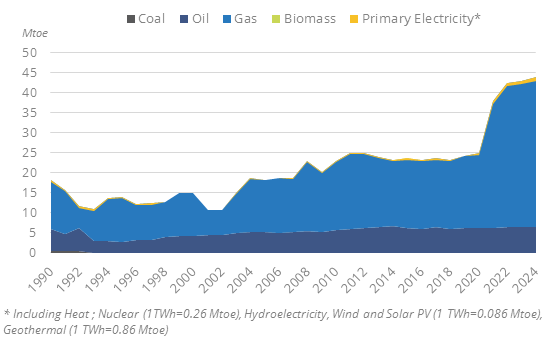 Total energy consumption has been growing rapidly since 2020 (by 6%/year), reaching 43 Mtoe in 2024. Previously, it had been increasing slowly by 0.5%/year from 2010 to 2019. Natural gas represents an increasing share of that consumption (85% in 2024, +11 pp since 2010) and oil 15%. Per capita consumption reached 5.7 toe in 2024.