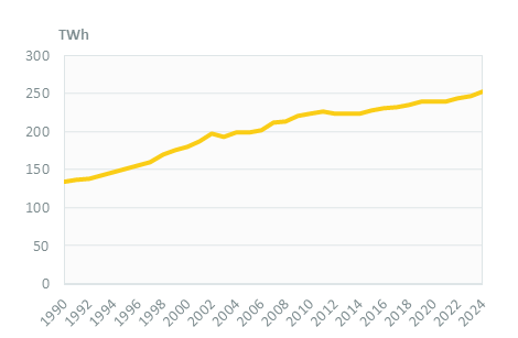 Electricity consumption increased steadily between 2015 and 2024, by 1.2%/year on average, reaching 252 TWh in 2024.