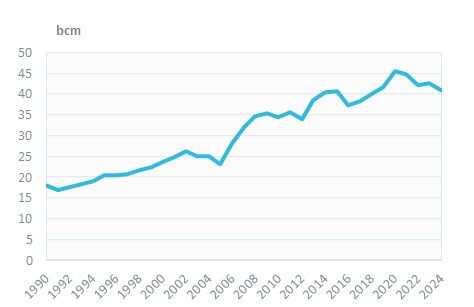 Natural gas consumption has been decreasing since 2020 to 41 bcm in 2024 (-2.5%/year on average), after a rapid increase between 2006 and 2020 (+4.4%/year on average). This increase was mainly driven by the development of gas-fired power capacity and the explosion of the LNG sector.