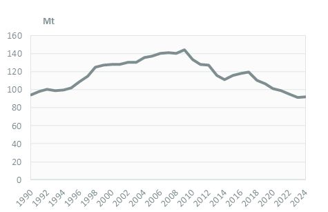 Coal and lignite consumption has declined by 36% since its peak in 2009, reaching 92 Mt in 2024. Most of the consumption goes to power generation (91%) and the remainder to industry.
