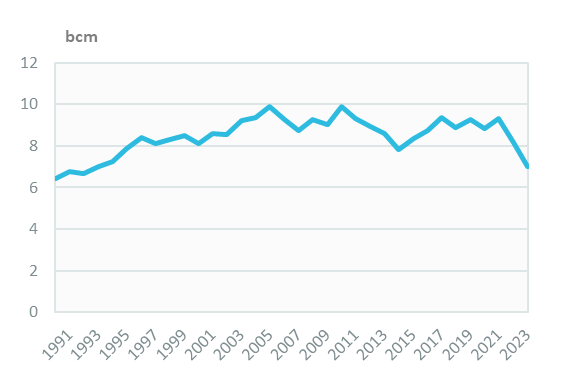 Gas consumption has dropped by 14%/year since 2021, reaching 7 bcm in 2023 (close to its 1990 level). It decreased rapidly over 2010-2014 (-5.6%/year) and rebounded by 5.9%/year between 2015 and 2017, whereas the 5% rebound in 2021 offset the 2020 decrease due to the Covid.