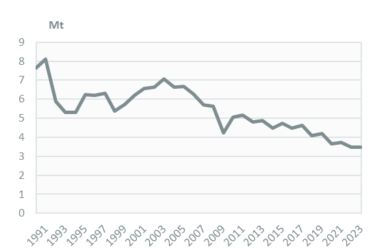Coal consumption halved between 2003 and 2023 to below 3.5 Mt.