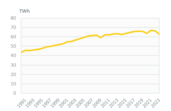Electricity consumption has continued fall by 3%/year since 2021, reaching 63 TWh in 2023. Over 2009-2019, it increased by an average of 1.1%/year, before decreasing by 3.4% in 2020 due to the Covid pandemic.
