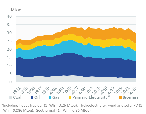 The national target to increase the share of renewables in gross final energy consumption to 34% by 2020 has been exceeded by 2.5 points. According to the final NECP 2024, the objective is to raise this share from 46-50% previously to 57% in 2030 (40.8% in 2023), of which 100% for electricity (87.8% in 2023) and 14% in transport (13.2% in 2023).