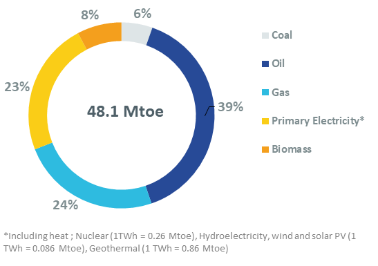 All the oil is imported (57 Mt in 2024). Crude oil accounts for around 58% of oil imports. In 2024, 21% of crude oil was imported from OPEP countries, Norway (18%), the US (18%), the UK (6%), and Kazakhstan (12%).