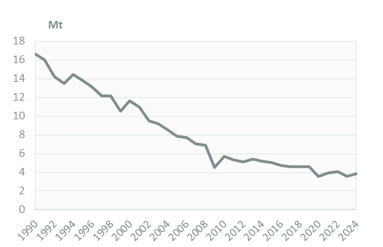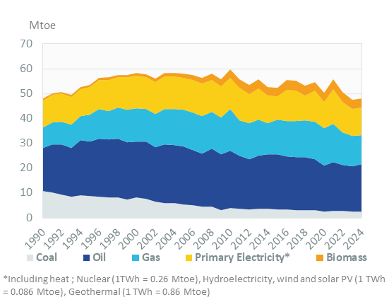 Coal consumption started a downward trend in 1990; it decreased by 3.5%/year over 2010-2023 and slightly increased in 2024 to 3.8 Mt.