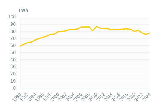In 2024, electricity consumption increased by 3%, for the first time since 2021, reaching 78 TWh. It remained roughly stable between 2010 and 2018, at around 83 TWh/year, and decreased by 1.6%/year until 2020.