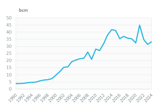 Gas demand increased by 6% in 2024 to 33 bcm, after two years of sharp reduction (-16%/year over 2021-2023). It is well below the exceptional peak in 2021 (45 bcm, because gas was used to substitute weaker hydroelectricity production due to major droughts). It decreased by 4%/year between 2014 and 2020. It rose at the strong pace of 12%/year between 1999 and 2014, mainly due to the power sector and, to a lesser extent, industry.