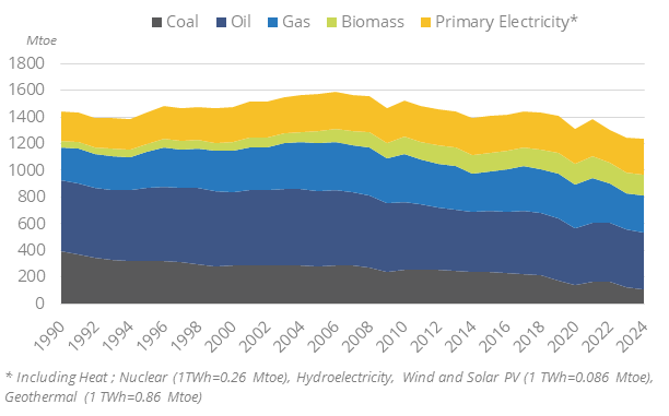 Natural gas production has been divided by 3.6 since 2010 (-9%/year), falling by 15% in 2023 and by 4% in 2024 to 41 bcm, mostly due to the closure of the Groningen field in the Netherlands in October 2023. Net imports (278 bcm in 2024) cover most of gas consumption (83% in 2024, up from 65% in 2010). Since 2022, gas imports have decreased by 10%/year (-7.5% in 2024) to 332 bcm.