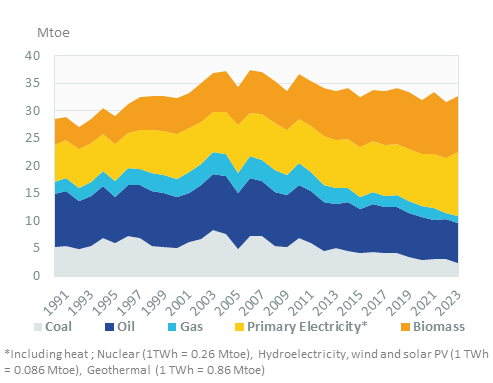 In 2023, coal and peat consumption decreased by 29% to 5 Mt. Coal and peat consumption, which had remained roughly stable between 2015 and 2018, fell by 15% in 2019 and 23% in 2020 and remained stable in 2021 and 2022 at around 7 Mt (of which, 60% peat), due to lower demand from the power sector.