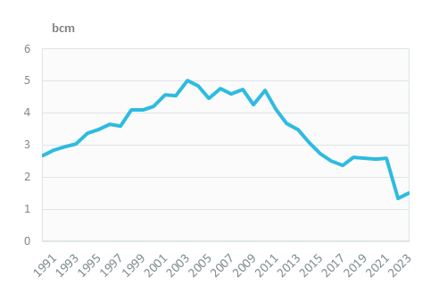 In 2023, gas consumption grew by 15% to 1.5 bcm, after a 48% drop in 2022. Gas consumption has remained stable at around 2.6 bcm since 2018. Previously, it had declined very rapidly (9%/year) between 2011 and 2017 to 2.3 bcm.