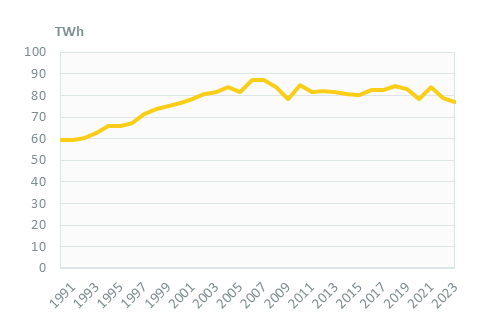 Electricity consumption decreased by 3% in 2023 to 77 TWh, after a 6% decrease in 2023 and a 6.8% rebound in 2021. Previously, it increased regularly by around 1.8%/year between 2015 and 2018.