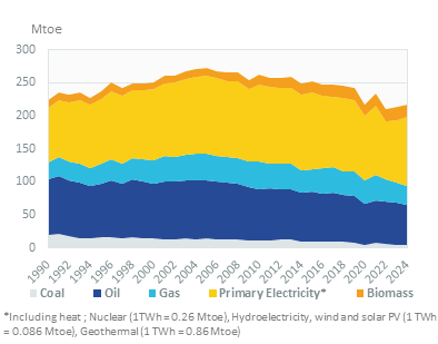 After a peak at 472 TWh in 2010, electricity consumption decreased by an average of 1%/year until 2023 and then remained stable in 2024, reaching 410 TWh (4%/year over 2021-23). Because of the importance of electric space heating, consumption trends are influenced by climate variations. At normal climate, the reduction has been slower (-0.6%/year over 2010-2023 and -4%/year over 2021-2023).