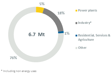 Since 2013, coal consumption has decreased by 8%/year to 7 Mt (-64% over 2013-2024), including -21% in 2023, as a result of the shutdown of virtually all French coal-fired power plants. Coal is mostly consumed in other sectors (coking plants) (76%).