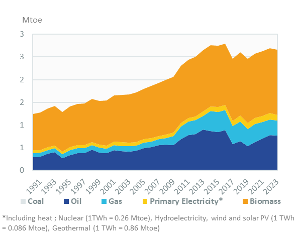 Total consumption has increased by 3%/year from 2019 to 2022 and remained stable in 2023 (2.7 Mtoe). It was stable from 2014 to 2019, after a rapid increase between 2000 and 2010 (13%/year, i.e. a 3.5-fold rise).