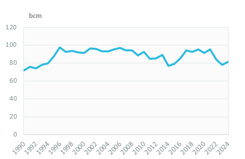 After a 2-year decrease following the shift to other energies due to the conflict between Russia and Ukraine, natural gas consumption rebounded by 4% in 2024 to 81 bcm due to the recovery in the industrial and power sectors. Previously, gas consumption soared by nearly 4%/year over 2014-2019.
