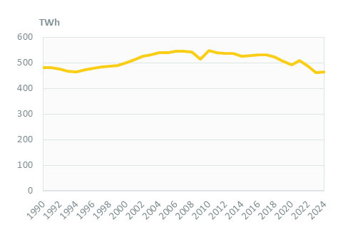 Per capita consumption decreased further to 2.9 toe in 2024 (-1.6%), many due to lower economic activity and warmer temperatures. Per capita electricity consumption also fell to 5 476 kWh.