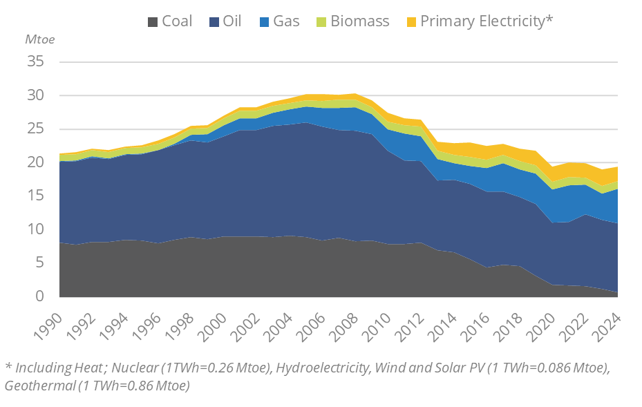 Primary energy consumption, which had been declining by 2.7%/year between 2010 and 2023, rebounded by 2.2% in 2024 to 19.8 Mtoe. It had increased by 2.4%/year between 1990 and 2005 to 30 Mtoe, before declining by 3.2%/year until 2013, when it stabilised around 23 Mtoe until 2019 (11% fall in 2020).