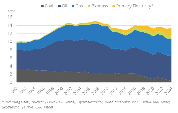 Total energy consumption has been decreasing slightly since 2021 (-0.4%/year), reaching 13.5 Mtoe in 2024. It was rather stable over 2016-2019 at around 14 Mtoe, after rapid growth between 2014 and 2016 (+4.4%/year) thanks to the economic recovery, and decreasing by more than 2%/year between 2007 and 2014 due to the economic slowdown.
