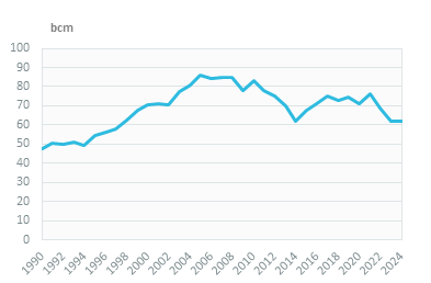 Between 2021 and 2023, gas consumption fell by 10%/year to 62 bcm in 2023 and remained stable in 2024, due to record high gas prices, mild temperatures, lower industrial demand, consumer efforts, and a lower demand from the power sector. Gas consumption in 2024 was as low as its 2014 level. Previously, it had recovered by 4%/year until 2019 (rising consumption in the power sector).