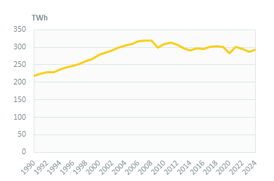 Electricity consumption increased by 2% in 2024 to 293 TWh, after two years of decline, as surging electricity prices in 2022 and still high prices in 2023 contributed to reduce demand in the industrial sector. It declined by 2%/year until 2014; after that, electricity consumption averaged 295 TWh until 2022.