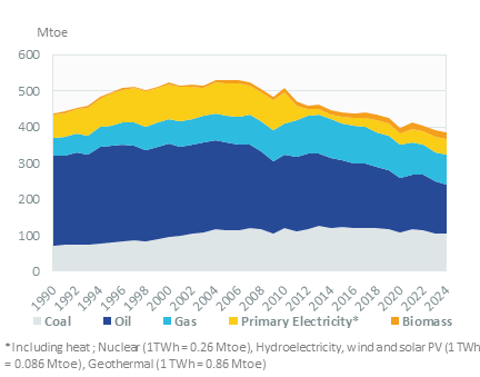 Total energy consumption has been decreasing by 2%/year on average since 2010, reaching 3 986 Mtoe in 2024.