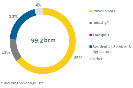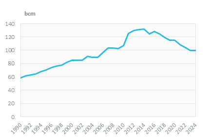 Gas consumption has decreased by around 2.5%/year since 2012, reaching 99 bcm in 2024 (23% below its 2012 level). Two thirds of natural gas is used for power generation.