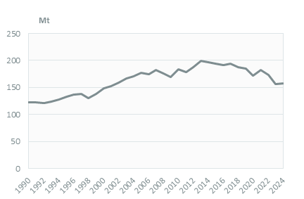 Coal consumption remained stable in 2024 at 157 Mt, following a 9% drop in 2023. After a rise between 1990 and 2007, coal consumption declined slowly between 2013 and 2022 (-1.1%/year).