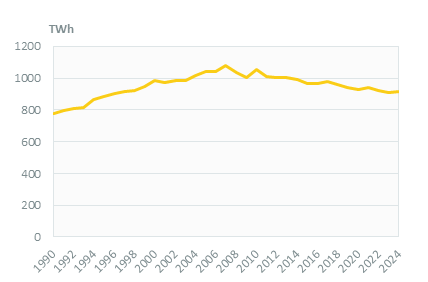 Electricity consumption has been slowly decreasing since 2010 (-1%/year on average), reaching 913 TWh in 2024, which is 22% below its 2010 level.