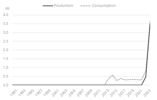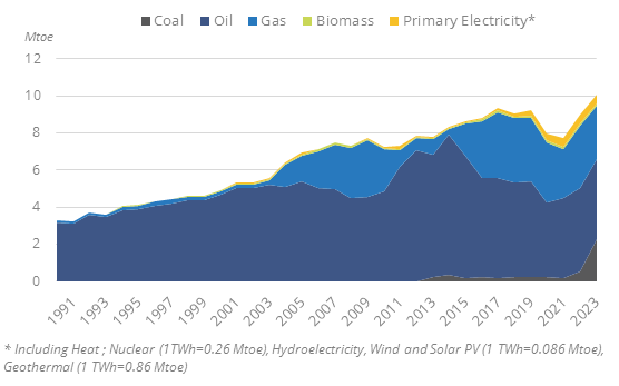 The country's total energy consumption has increased very rapidly since 2021, by 14%/year to around 10.3 Mtoe in 2023. Consumption per capita reached 0.9 toe/cap.
