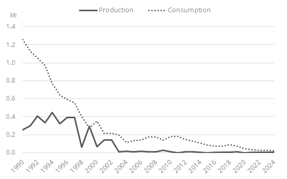Coal and lignite consumption has fallen steadily since 2010 by 15%/year, after a tenfold decrease between 1990 and 2004 (reduced use for CHP and heat plants). It is now marginal in Latvia's energy mix (less than 1% and 27 kt in 2024).
