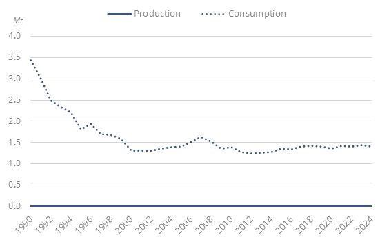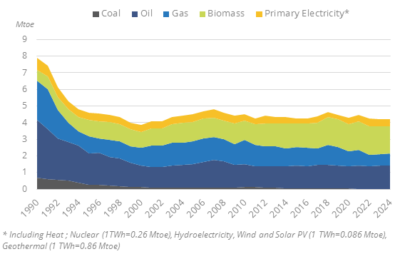 Since 2011, total energy consumption has fluctuated around 4.3 Mtoe (4.2 Mtoe in 2024).