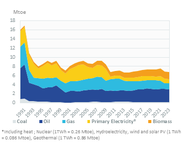 Between 2021 and 2023, total energy consumption decreased by 12%/year (6.8 Mtoe in 2023), after rising by 2% between 2015 and 2021.