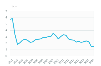 Since a peak in 2007 (3.55 bcm), natural gas consumption has gradually fallen by 5.3%/year, reaching 1.49 bcm in 2023.