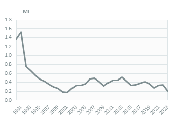 Coal consumption dropped by 40% in 2023 (0.2 Mt), after fluctuating around 0.4 Mt between 2005 and 2022.