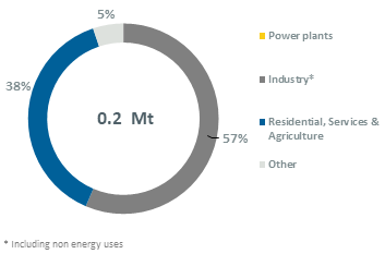 Buildings (residential-services sector) absorb 38% of the consumption, while industry (mainly non-metallic minerals) accounts for 57% (2023).