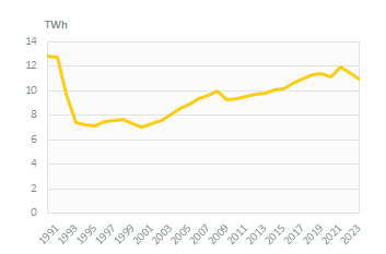 Electricity demand decreased by 4%/year between 2021 and 2023 (11 TWh), after a 2.3%/year increase between 2010 and 2021.