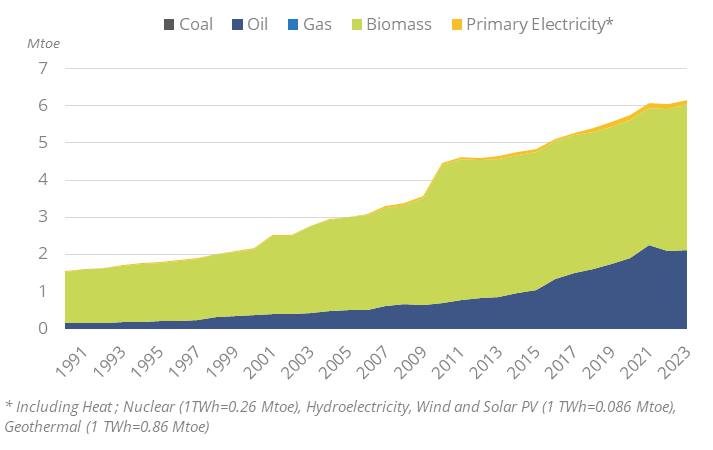 Total energy consumption has increased by 2.5%/year since 2010, reaching 6.2 Mtoe in 2023. That consumption jumped by nearly 25% in 2010 after the country recorded very high economic growth (~7%). Energy consumption per capita is low, at about 0.3 toe/capitain 2023, compared to the average for Sub-Saharan Africa (0.6 toe/capita).