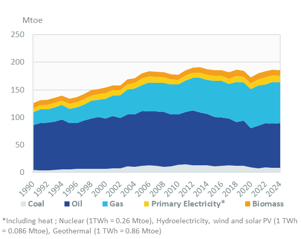Total energy consumption increased by around 3%/year on average from 2020 to 2023, and remained stable in 2024 (186 Mtoe). Previously, it had been decreasing slightly over 2013-2019 (by 0.5%/year) and dropped by 6.5% in 2020 with the COVID pandemic.